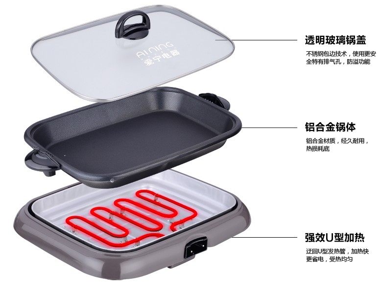 多功能電烤盤,外形大方,結(jié)構(gòu)簡單,雙層水性涂層,分體式,便于清潔,集烤、烙、煎、炸、炒于一身。